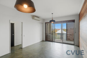 - Lounge room with split system air conditioner and sliding doors leading to balcony