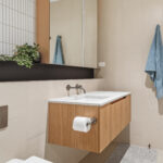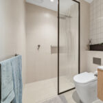 The modern bathroom is designed with an art-deco twist and is exquisite in design and finish with floating vanity bench, matching tapware and floor to ceiling tiles, luxury has arrived.