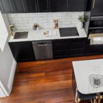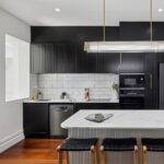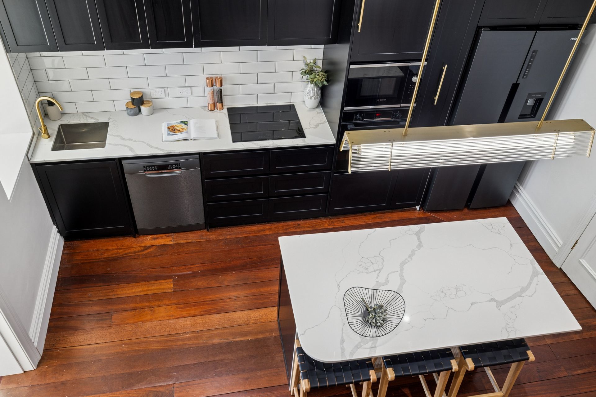 Step inside to find thoughtfully designed interiors spanning 100 square meters of comfortable living space. Downstairs you’ll find the third bedroom with bi-fold doors opening into an open-plan dining and kitchen zone, with sleek marble benchtops, subway-tile splashbacks, soft-close cabinetry, and premium Bosch appliances including induction cooktop, oven, built-in microwave, and dishwasher.