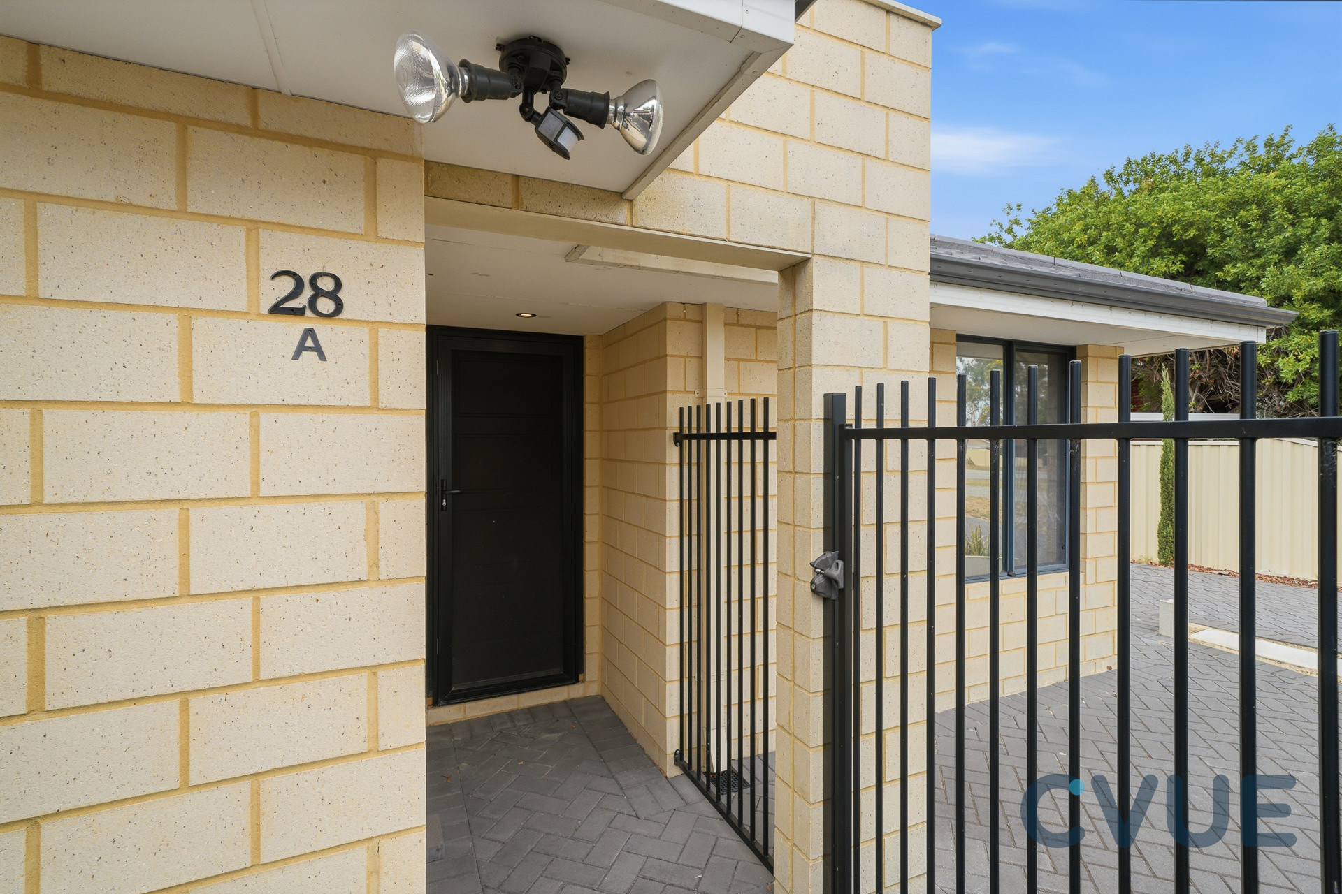 – Covered front patio with security gate