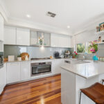 –	Modern kitchen with 5 burner gas stovetop, large electric oven, dishwasher, microwave and plenty of storage