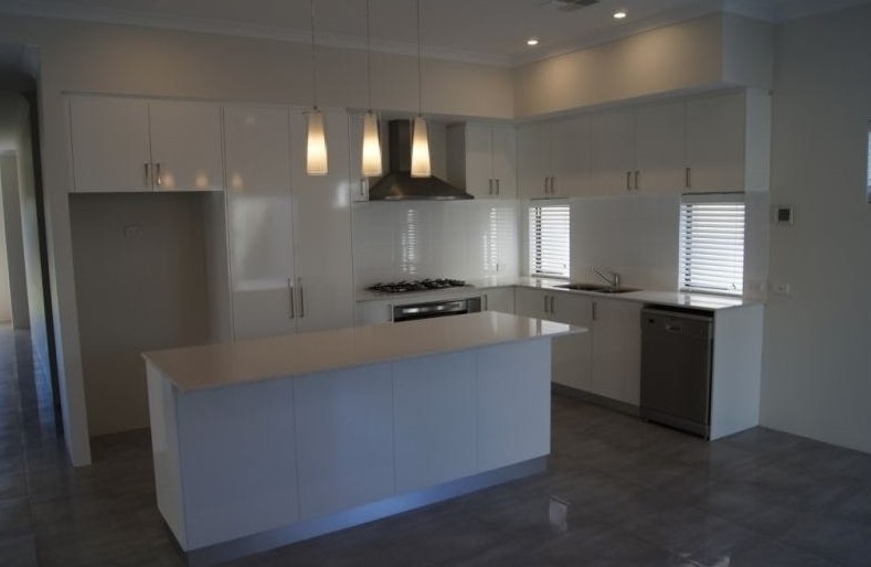 – Modern kitchen with gas stovetop, electric oven, dishwasher, plenty of storage and island benchtop