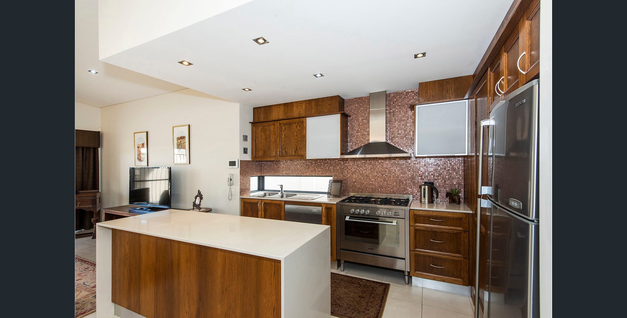 – Modern kitchen with gas stovetop, large oven, dishwasher, plenty of storage and island benchtop