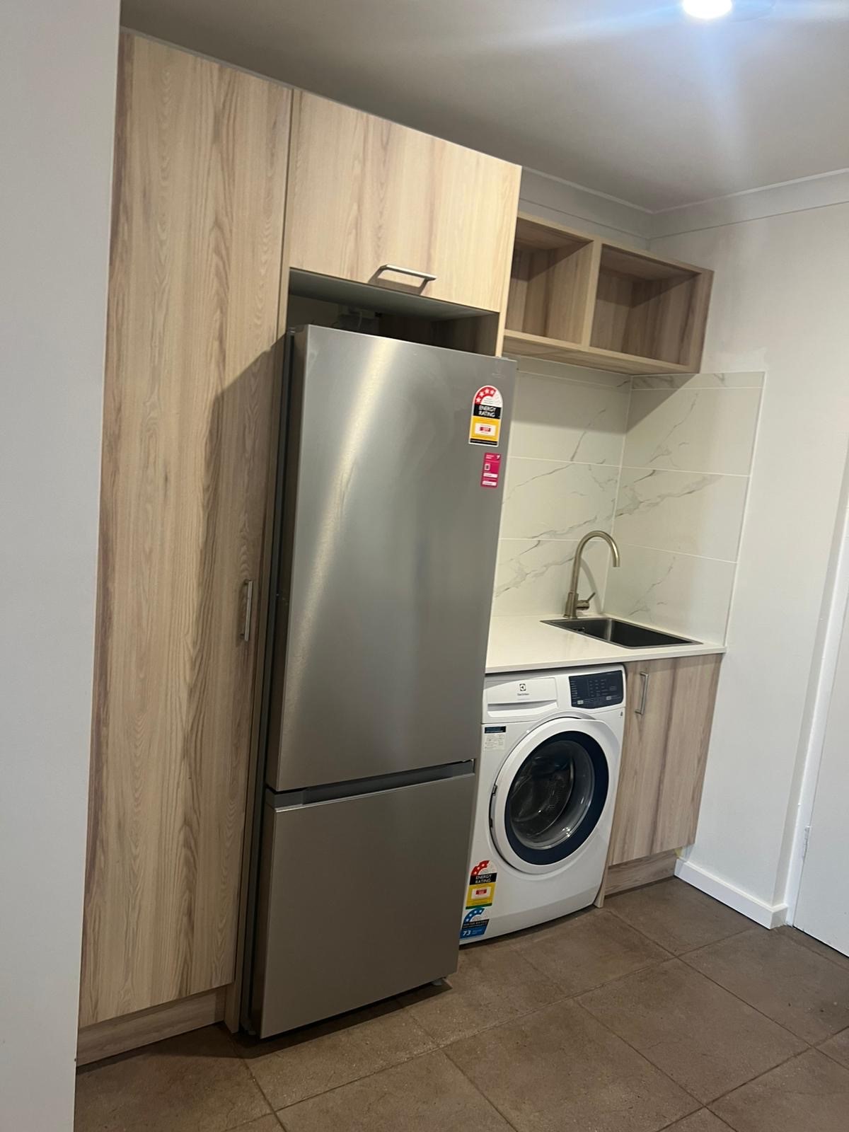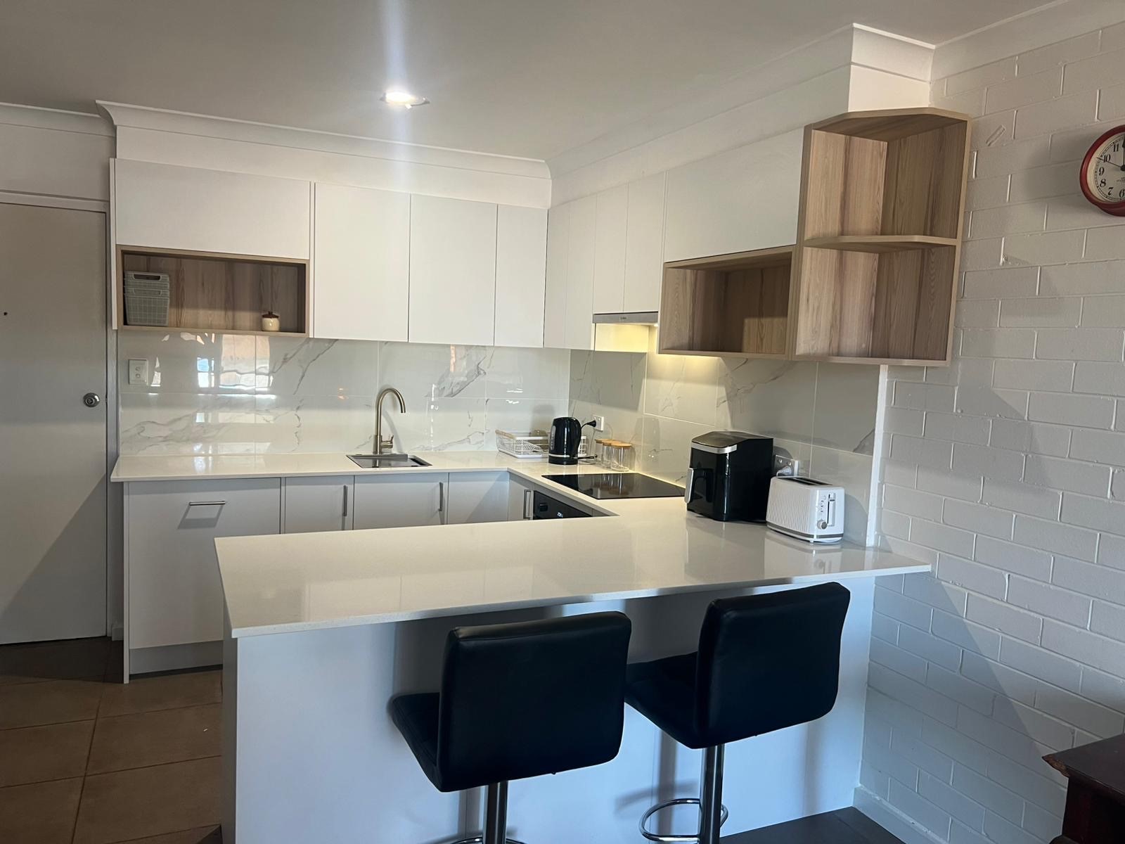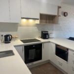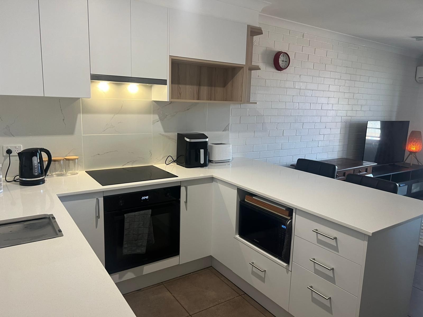 – Modern kitchen with electric stovetop and oven, plenty of cupboard space and large benchtop that can double as a breakfast bar